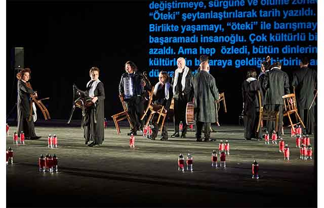 Övül A: Bu bir göç hikâyesi. Benim anneannem de ailesiyle Makedonya'dan göç ederken bir baskın sonrası sadece yanlarına ne alabildilerse onlarla kaçmışlar. Yani varlıklarını, sahip olduklarını bırakıp taşıyabildiklerini alıp canlarını kurtarmışlar. Dolayısıyla bizim hikâye anlatıcılarımız da sahnede sadece sandalyeleri, heybeleri, enstrümanları ile hareket ediyor.