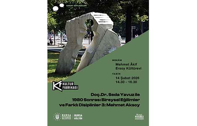 Bursa’yı bir sanat merkezi hâline getirmeyi hedefleyen Bursa Kültür’ün Kültür Fabrikası’nda düzenlediği “1980 Sonrası Bireysel Eğilimler ve Farklı Disiplinler” başlıklı Sanat Söyleşileri serisinde Doç. Dr. Seda Yavuz, Türkiye’de 1950’den günümüze sanat yaklaşımını inceliyor. 14 Şubat 2026 Cumartesi günü 14.30’da Mehmet Âkif Ersoy Kültürevi’nde gerçekleşecek üçüncü buluşma, 1980 sonrası Türk heykel sanatında bireysel eğilimler ve disiplinlerarası yaklaşımları, heykeltıraş Mehmet Aksoy odağında mercek altına alacak. Doç. Dr. Seda Yavuz söyleşide, sanatçının üretimlerini dönemsel ve kavramsal bağlamlarıyla değerlendirecek.