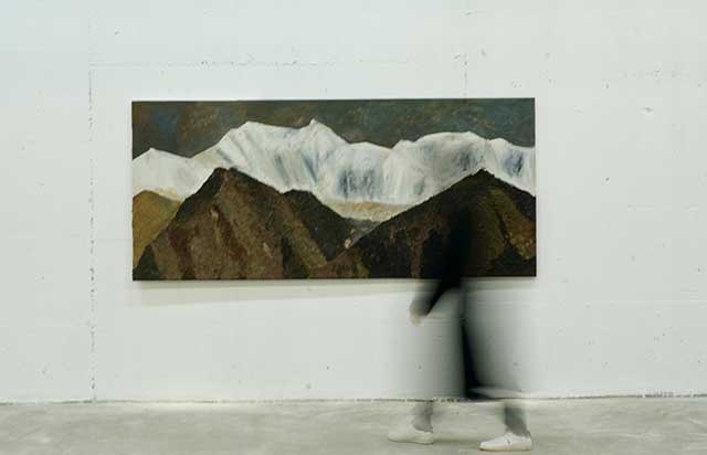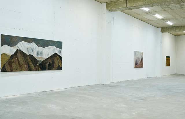 Marcus Graf: Ali Ekber Kumtepe’nin sergisi, aslında onun dünyasına açılan bir yolculuk. Bu yüzden sergi girişi de bir koridor olarak tasarlandı. Bursa’nın dünyasından, Ali Ekber Kumtepe’nin manzaralarına geçiyoruz. Bu geçiş, girişte kullanılan malzemeler—kum, rüzgâr ve ses—sayesinde izleyiciyi dış dünyadan bu yeni dünyaya davet ediyor. Bu sayede izleyici, sadece resimlere bakmakla kalmıyor, kendi yolunu bu katmanlı manzaralar içinde buluyor.