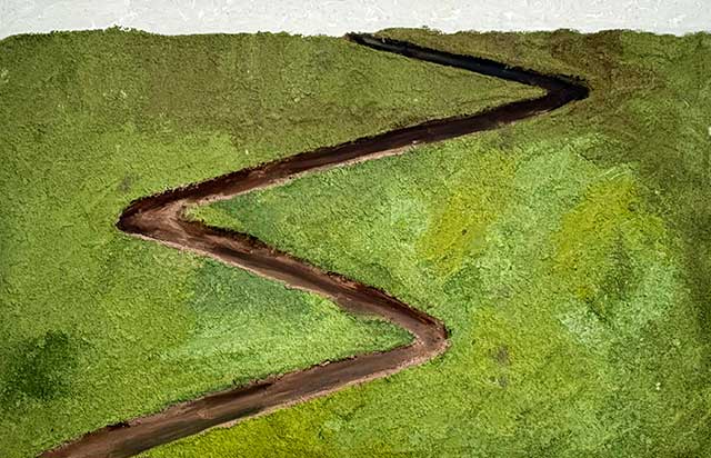 Kumtepe’nin yaklaşımı pitoresk bir manzara temsili değil; aslında bireysel zihin manzaraları yaratıyor. Kullandığı çok katmanlı malzemeler de geleneksel peyzaj resminin ötesine geçiyor. Yani o, sadece bir doğa manzarası değil, insanın iç dünyasında yolculuk yaptığı yeni bir anlam alanı sunuyor.