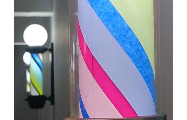 Paker, görüşmemizde “Berber Lâmbaları” üzerine konuşurken de bizlere şu bilgileri veriyor: “Marcel Duchamp’ın ‘Rotorölyef’leri veya ‘optik disk’lerinin yaratısından bu yana, neredeyse 100 sene geçti. Duchamp çok hafif bir kartona işlediği renkler ve döndürücü bir girdap yaratarak onları izleyiciyi ‘trans dünyası’na yaklaştırıyordu. Adeta, 20. yüzyılın başında çok rağbet gören hipnoz ve psikoloji pratiklerini içine alıyor ve algılıyordu. İşte benim de, ‘hazır malzeme – ready made’ olarak kullandığım ve içini geleneksel malzemeler ile renk, çoğullaşmış yara bantları renklenmiş, skan edilip renkler, kâğıda geçtikten sonra uygulanıp, formları silindirin içindeki yerlerine yerleştirilmiş bulunuyorlar. Diyagonal, spirale geçerken üç boyut bize belki de gelecekteki ışık prizmasına yaklaştırıyor.”