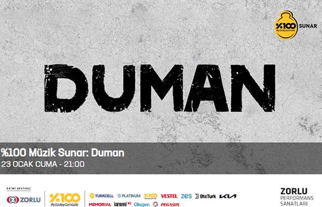 1999 yılında İstanbul'da kurulan ve aynı yıl yayımlanan "Eski Köprünün Altında" albümüyle kariyerine hızlı bir başlangıç yapan Türk Rock grubu Duman; yayımladığı her albümü ve efsaneleşmiş sayısız şarkısıyla müzik listelerinde en üst sıralarda yerini aldı. Müzik piyasasında iz bırakan şarkılarla konserlerine devam eden Duman; 11 yıl sonra çıkan albümleri "KUFİ" ile hayranlarının yeni albüm özlemini de giderdi. Türkiye'nin Rock müzik denilince akla ilk gelen ismi Duman, %100 Müzik katkılarıyla 23 Ocak akşamı unutulmayacak bir konsere imza atmak üzere Turkcell Sahnesi’nde!