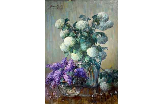Sami Yetik, “Kartopu Çiçekleri Ve Mor Sümbüller”, İmzalı, 1942 tarihli. Tuval üzerine yağlıboya. 88 x 62 cm. Fiyat istek üzerine verilir.