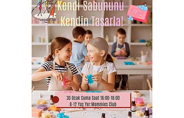 Sabun Atölyesi'nde renkli bir serüven. Küçük eller büyük yaratıcılıklar. 8 - 12 yaş grubundaki çocuklar hem eğlenip hem kendi sabunlarını tasarlayabilecekleri dinamik bir atölyeye davetliler. Çocuklar kendi seçtikleri renk ve kokularla hayallerindeki sabunları tasarlayacak, el becerilerini geliştirirken çok keyifli vakit geçirecekler.