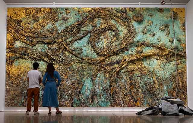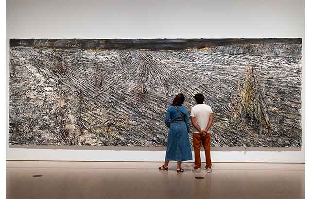 Üç ayrı odaya bölünen sergide ilk bakışta Kiefer’in anıtsal boyutlardaki eserleri ile Van Gogh’un daha küçük tuvalleri arasında pek bir bağ yokmuş gibi görünebilir. Van Gogh geleneksel yağlı boya ve mürekkep gibi klasik malzemelerle çalışırken Kiefer bunlara akrilik, suluboya ve fotoğraf gibi tekniklerin yanı sıra saman, tohum, kurşun ve altın varak gibi alışılmadık unsurlar ekliyor hatta yüzeyi ateşle işlediği yöntemler kullanıyor. Ancak bu malzeme ve teknik farklılıklar onları aslında ortak bir noktada buluşturuyor: Katmanlı ve dokusal zenginlik, derin perspektifler, yüksek ufuk çizgileri ve eserlerine eklenen çok boyutlu ifade gücü.