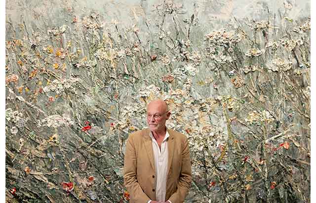 Installation view of the ‘Kiefer / Van Gogh’ exhibition at the Royal Academy of Arts, London (28 June - 26 October 2025), showing Anselm Kiefer with his work: Walther von der Vogelweide: Under the Lime Tree on the Heather (Walther von der Vogelweide: under der Linden an der Heide), 2014. Courtesy of the artist and White Cube. Photo © Royal Academy of Arts, London / David Parry. © Anselm Kiefer