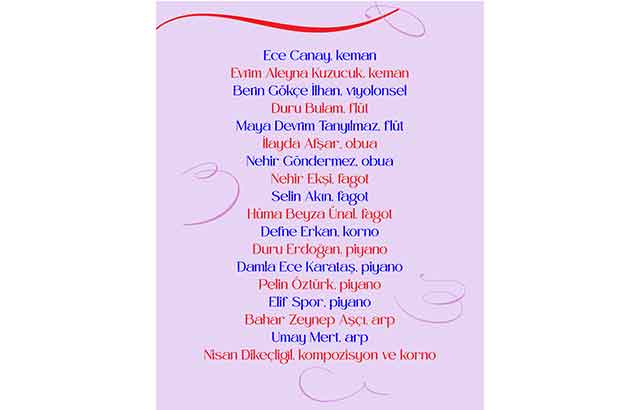 “Yarının Kadın Yıldızları: Genç Kadın Müzisyenler Destek Fonu” kapsamında desteklenen müzisyenler keman, viyolonsel, flüt, obua, fagot, korno, piyano, arp ve kompozisyon gibi geniş bir enstrümantal dağılım oluşturuyor. Bu çeşitlilik, programın yalnızca belirli bir çalgı grubuna değil, orkestral ve solo müzik üretiminin farklı damarlarına yayıldığını ortaya koyuyor.